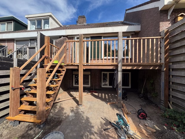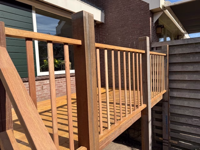 Een maatwerk hardhouten terrasvlonder in Anna Paulowna, duurzaam gebouwd met stevige trap en balustrade. Het verhoogde terras biedt een prachtig uitzicht over de tuin en is uitgevoerd in vlonderhout dat lang meegaat, perfect passend bij de woning en omgeving.